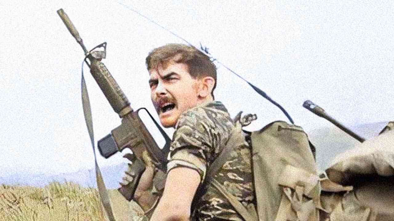 Albert “The Mantis” Theodore wearing his signature tiger stripe uniform on the Island, during the Memphis Crossing. Photographer PFC L. Gardner from 8th Company, 2nd Brigade.