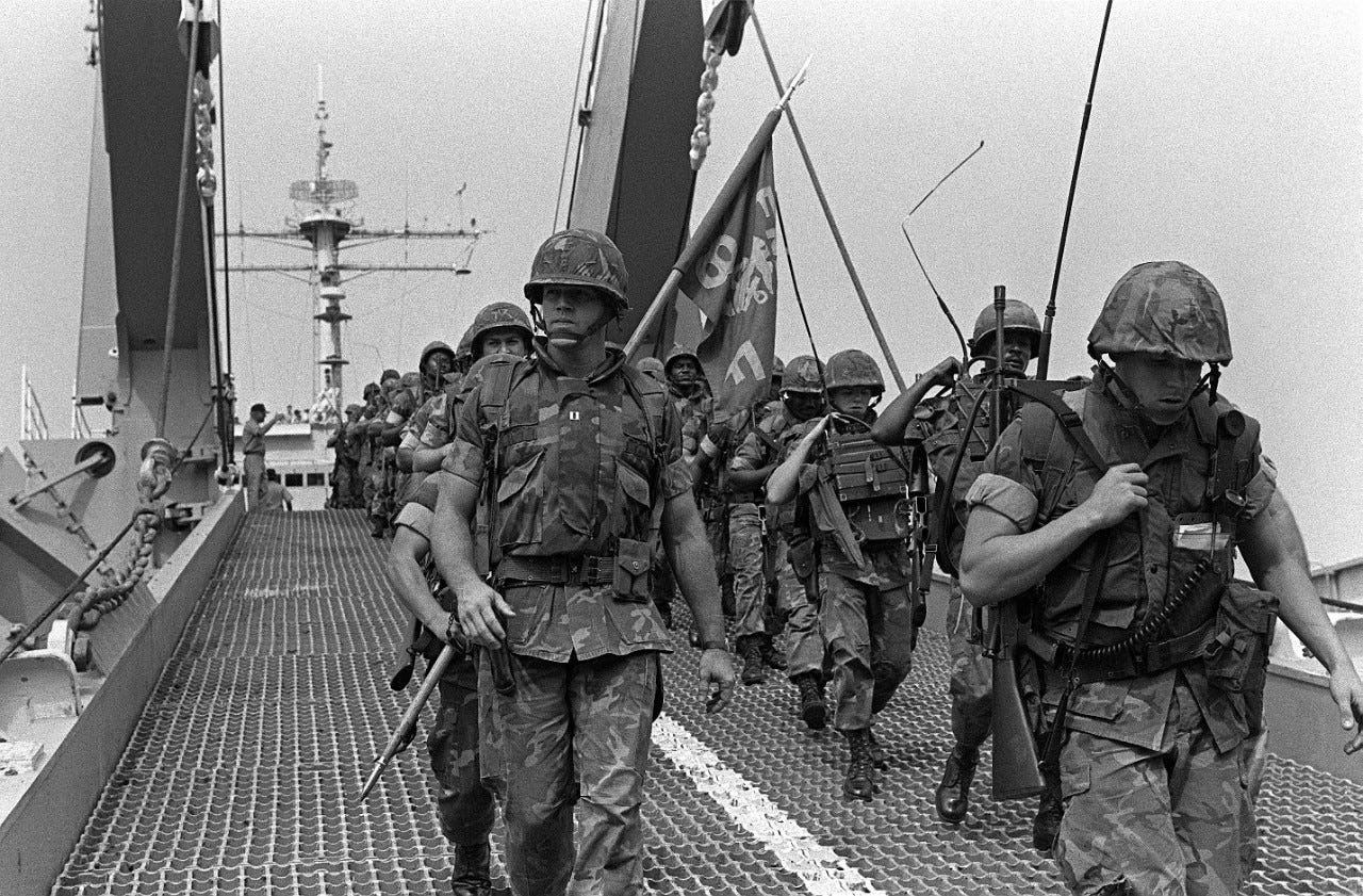 U.S.M.C infantry exiting a landing craft vehicle, coming ashore ready to continue the fight against the SRC/SVB.