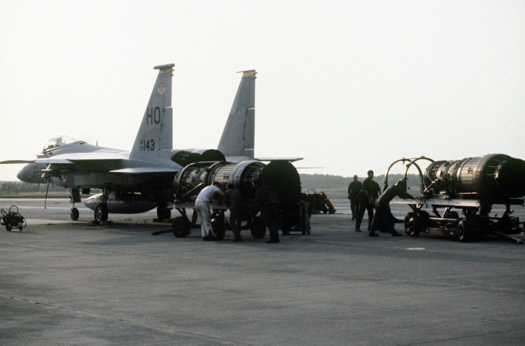 F-15 of the 49th Wing, 8th Tactical Squadron, undergoing an engine swap.